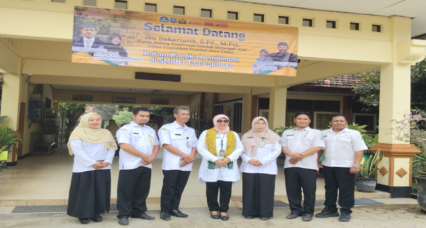 Tambakboyo, 16 April 2025 – SMAN 1 Tambakboyo mendapatkan kunjungan dari Ibu Suhartatik, S.Pd., M.Psi., Kepala Bidang Pembinaan Sekolah Menengah Atas Dinas Pendidikan Provinsi Jawa Timur. Kunjungan ini merupakan bagian dari agenda pembinaan rutin yang menyasar sekolah-sekolah di wilayah pesisir dan pedesaan guna memastikan peningkatan kualitas pendidikan berjalan merata.