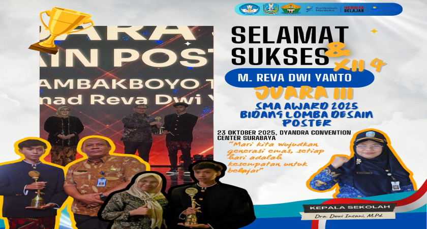 M. Reva Dwi Yanto siswa kelas XII 4 SMA Negeri 1 Tambakboyo berhasil meraih Juara III dalam kegiatan lomba Desain Poster SMA AWARD yang diselenggarakan oleh provinsi Jawa Timur Tahun 2025.